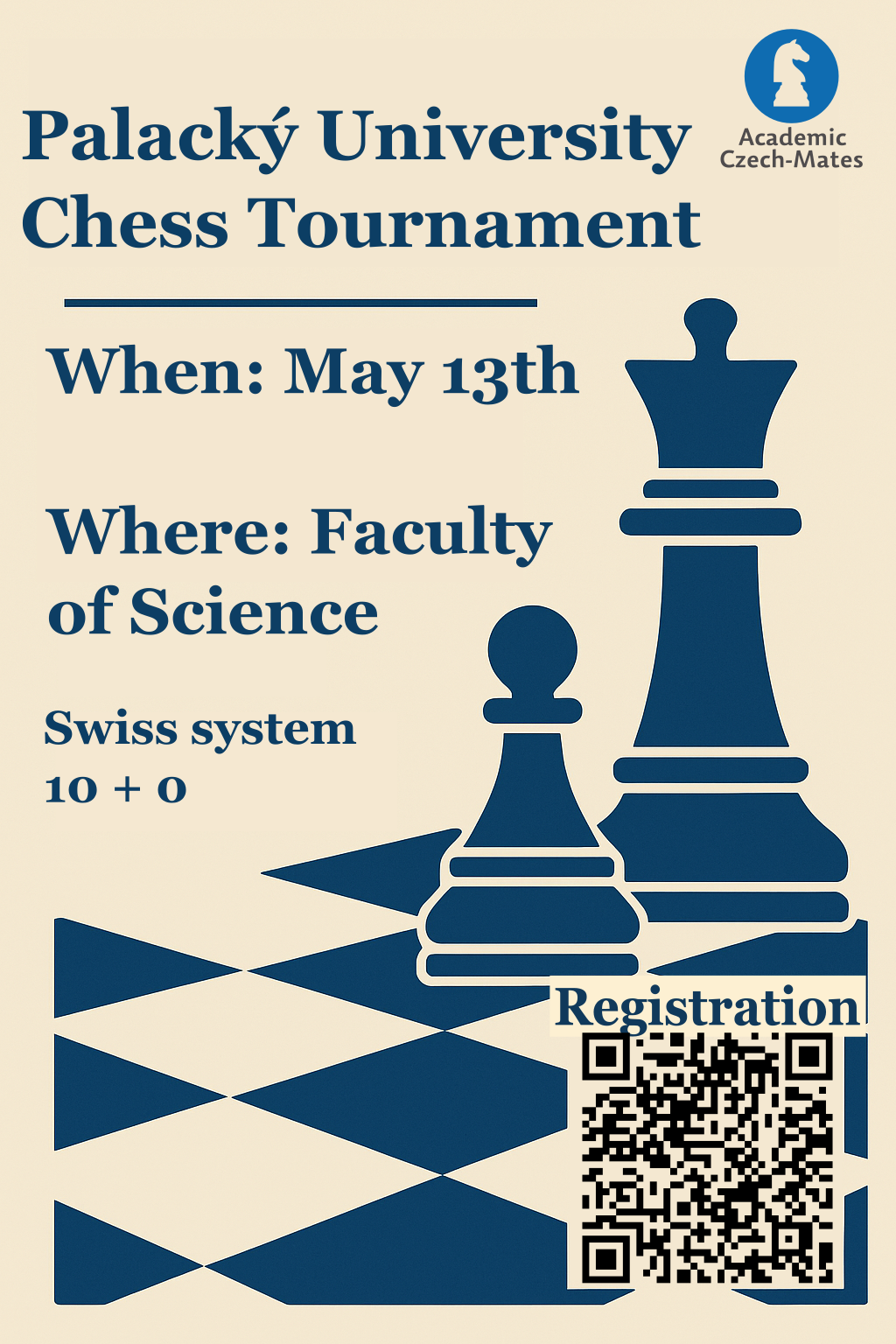 As part of the Sports Day, we invite you to the Palacký University Chess Tournament, which will take place on 13 May from 8:30 AM at the Faculty of Science main building. The tournament will be played in the Swiss system with a 10+0 time control over 7 rounds. Registration is available via the QR code or the link provided. We look forward to seeing you there!
