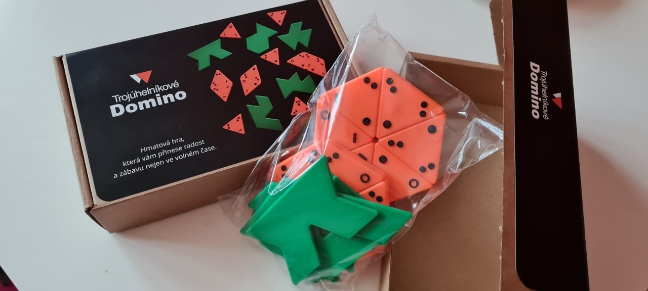 Trojúhelníkové domino je herní sada, která se skládá z 12 shodných rovnostranných trojúhelníků oranžové barvy (dominových modulů) a z 6 různých nekonvexních rovinných útvarů (předloh) barvy zelené. Každý dominový modul trojúhelníkového tvaru je ve svých rozích opatřen jedním reliéfním znakem (hmatovým bodem). Těchto znaků je celkem 6 – prázdné kolečko, svislá čárka, vodorovná čárka, 1 tečka, 2 tečky vedle sebe, 2 tečky nad sebou. Jeden z modulů v jednom rohu obsahuje znaky dva. Úkolem hráče je správně vybrat 9 z 12 dominových modulů a sestavit z nich domino dle zelené předlohy. Skládání se provádí tak, že trojúhelníky k sobě přiléhají vždy stranami s identickými znaky. Jednotlivé dominové moduly jsou na bocích opatřené magnety, které zajistí udržení jednotlivých modulů při skládání do požadovaných tvarů.