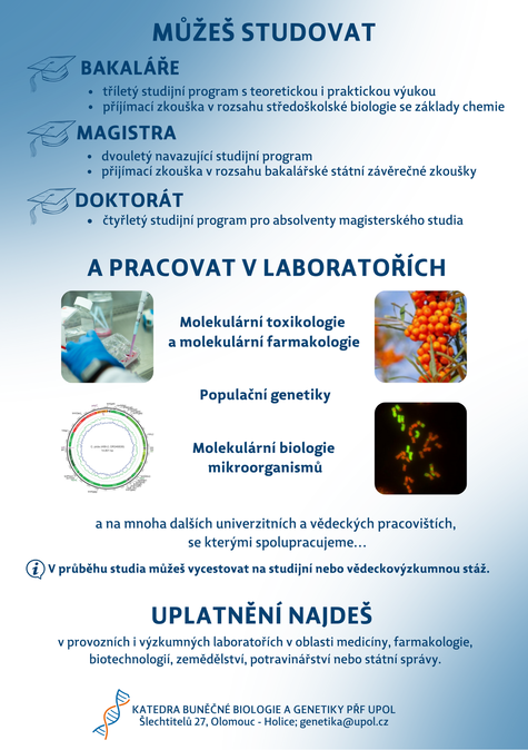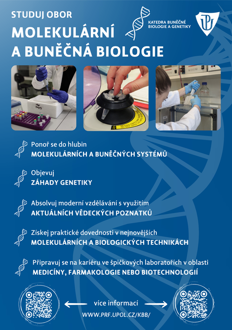 Studium molekulární a buněčné biologie na bakalářské, navazující magisterské i doktorské úrovni představuje samostatný biologický obor zahrnující rychle se rozvíjející disciplíny a jejich praktické aplikace. Program se zaměřuje na zkoumání biologických procesů na molekulární a buněčné úrovni, se zvláštním důrazem na uchování, přenos a expresi genetické informace. Úzce spolupracujeme s pracovišti Akademie věd ČR a špičkovými vědecko-výzkumnými centry.