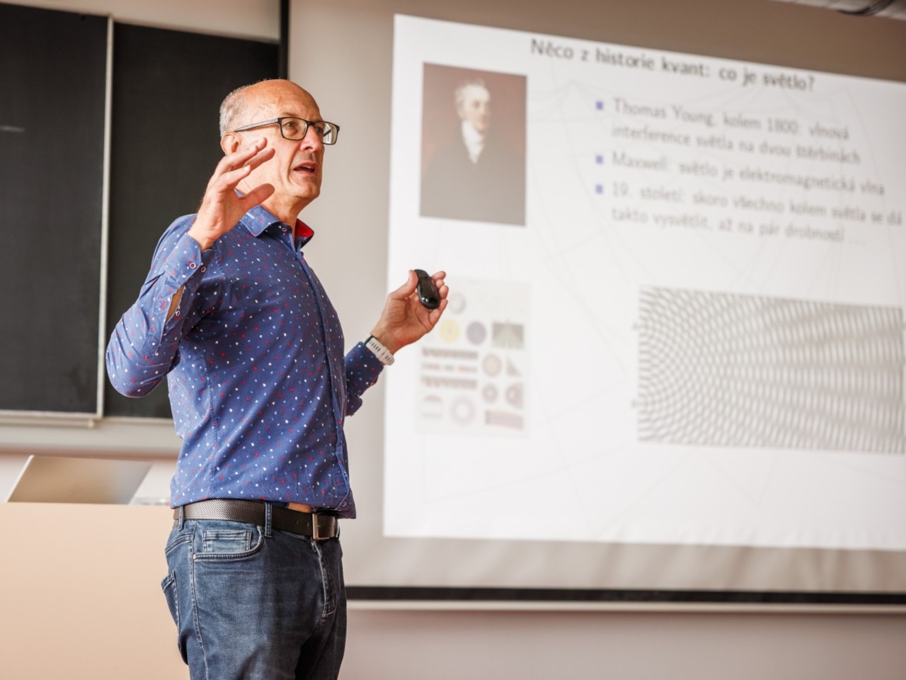 Doktorandka z katedry optiky společně s Vojtěchem Kalou připravila úvodní přednášku nazvanou Od senné rýmy po kvantové technologie: století, které změnilo fyziku. Historický kontext svou přednáškou doplnil Tomáš Opatrný, který se zároveň dotkl záhad, které kvantová fyzika skrývá. Lukáš Slodička poté předvedl, jak dnes vědci zkoumají interakci záření a látky či jak zachytit jednotlivé atomy v pasti a k čemu je lze poté využít.