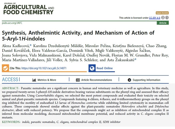 Náš nový článek v J Agric Food Chem popisuje sérii 5-aryl-1H-indolů s výraznou anthelmintickou aktivitou. Vybrané sloučeniny účinně paralyzují živočišné i rostlinné parazitické hlístice, přičemž vykazují nízkou toxicitu vůči savčím buňkám. Kombinací biologických testů, genetických mutantů a molekulárního modelování jsme odhalili jejich pravděpodobný mechanismus účinku na mitochondriální komplex II. Studie ukazuje, že jednoduchý indolový skelet může představovat slibný základ pro vývoj nové generace udržitelných antiparazitik.
