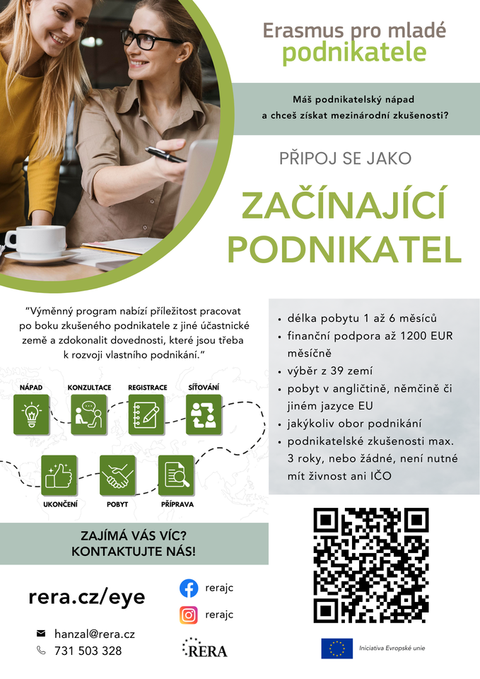 Erasmus pro podnikatele je unikátní výměnný program Evropské unie. Přináší začínajícím podnikatelům, nebo těm, kteří o podnikání teprve přemýšlejí, šanci načerpat zkušenosti v zahraničí. Program nabízí pobyt v jedné ze 39 zemí Evropy v délce 1 až 6 měsíců. Vycestovat lze s jakýmkoliv podnikatelských nápadem.