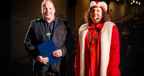 V textu fotografie vítězů prvního ročníku soutěže: Kamila Kopeckého (na snímku s tehdejší prorektorkou Lucií Plíhalovou) a Kateřiny Valchařové. Foto: Vojtěch Kmenta